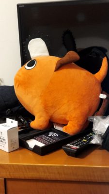 チェーンソーマンのぽちたくんはすごく眠りやすい枕なので持ってきています。長期の仕事は睡眠の質が大切です。