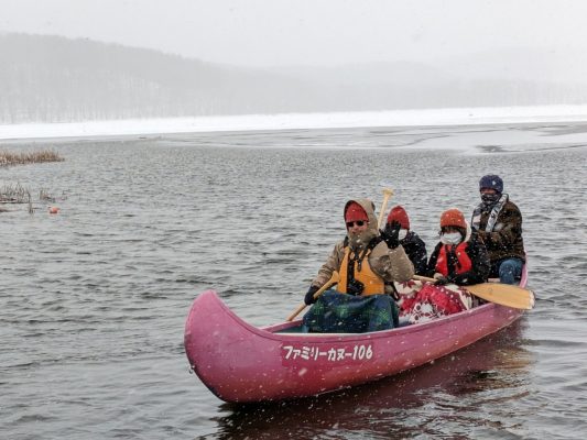 初日は釧路川でカヌー体験を行いました。−10℃の世界では川は凍結してしまいカヌーなんて本当にできるのかなあと思っていましたが水が湧いている関係で凍らずにいる様です。私たちがおとづれた際にはちょうど雪が降っており雪が降っている中のカヌー体験とすごく珍しいものになりました。ガイドの方が基本的に漕いでくださるので体力的に自信がない方でも参加いただけます!