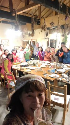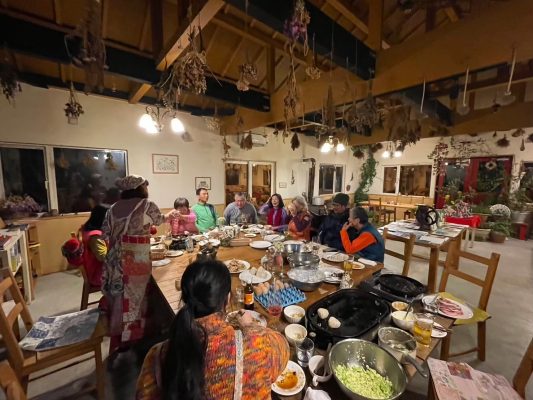 夜にはハートンツリーさんに宿泊されていた台湾からのお客さま8名と一緒に夕食をいただきました。ラム肉、お好み焼きなど北海道、日本を代表するご飯を一緒に楽しむことができました。日本のお抹茶体験も行いました。最後に音を立てて啜るということが難しいようで苦戦していましたが美味しくお茶を楽しむことができていました。また、以前にも鶴居村にきたことがあるそうでその時の写真等様々な地域の写真も見せてくださいました。