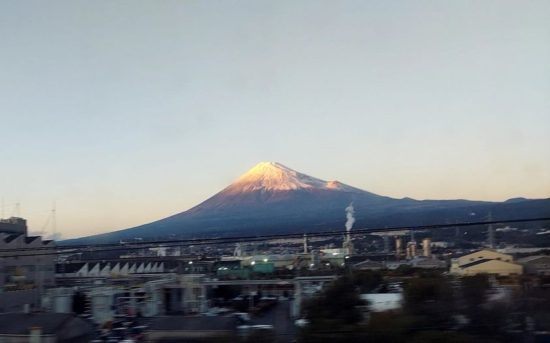 新幹線から見た富士山は、冠雪した山頂が夕日で赤く染まってきれいでした。寒気が来る直前の暖かい陽気の日に綺麗な富士山を遠くに眺めることができました。
