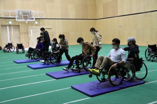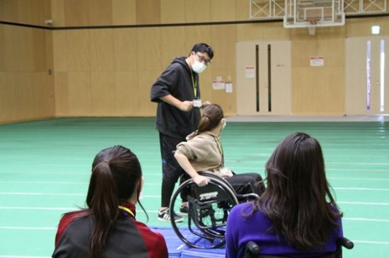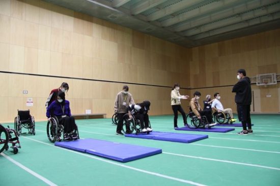 説明を受け、実際に2人一組になって練習。私は初め、想像以上にバランスのとれるポイントが後ろであることにびっくりしました。「これ以上行くと倒れてしまう…!」という恐怖感をまず抱くので、そこをいかに克服するかが第一関門です。恐怖感を克服したら、次はキャスターの上がった状態で小刻みにハンドリムを動かし、体勢をキープする練習。これもまた、はじめはすぐに前後に傾いて失敗してしまうことが多く、習得に時間がかかりました。試行錯誤を繰り返しながら、みんな何とか、何とかできるようになりました!