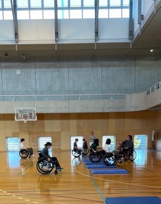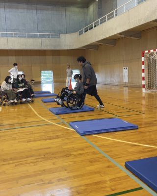 他にはゲームを利用して車いすの操作スキルを高めました。実際に行ったゲーム内容としては車いす版いす取りゲーム、体力づくりを目的としたゲーム、鬼ごっこを行いました。それぞれに車いすで外に出た時に必要となる能力を得ることができるようになっています。車いす版いす取りゲームでは周りをみる力、小回りが効くようにする力などが得られるようになっています。皆さん車いす操作を楽しんでいる姿が印象的でした。