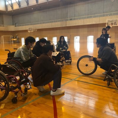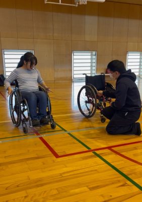2日目のはじめには、前日の筋肉痛をほぐすためのストレッチを行いました。ストレッチも車いすを利用した方法で行うことによってより参加者の皆さんの車いすに対する意識が変化したように感じました。また、実際の車いすユーザーの方であっても参考となるような方法のストレッチを行うことによってより参加者の将来に生かすことができるような情報を取り入れることができたように感じました。